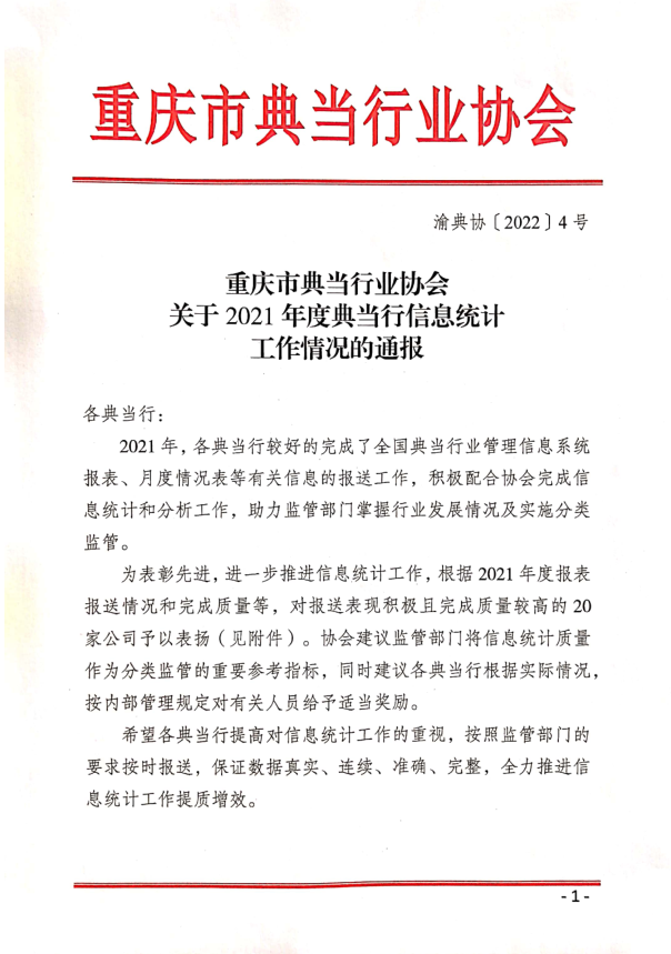 重庆市典当行业协会关于2021年度典当行信息统计工作情况的通报